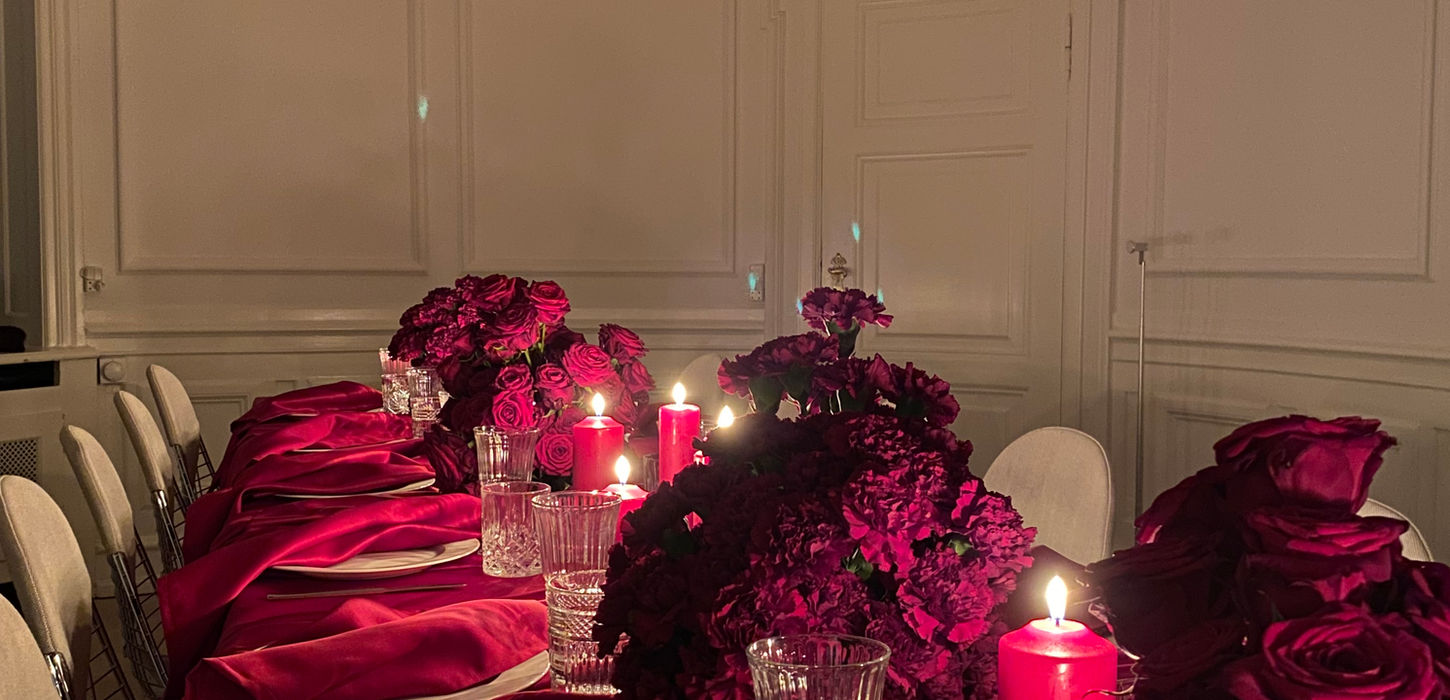 A crimson-heavy Christmas. For Cras' festive gathering, I created a full-concept setup – from deep red floral compositions and glossy satin napkins to custom tablecloths and candlelit ambiance. Every element was designed to elevate the space and challenge the clichés of traditional holiday styling. Bold, dramatic, unapologetically red – yet intimate and full of warmth. A celebration of contrast and cohesion. Of fashion meeting florals in an immersive dining experience.