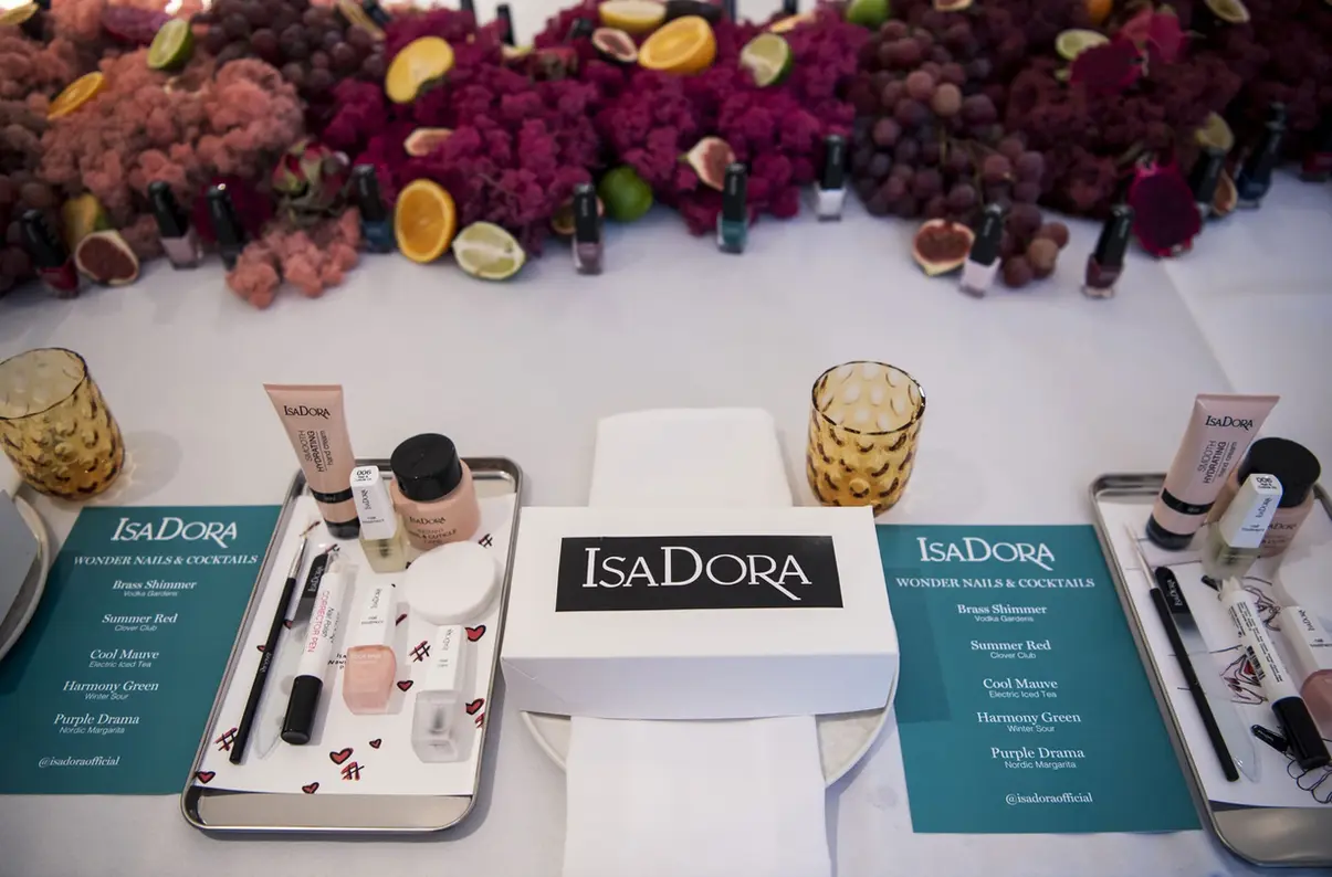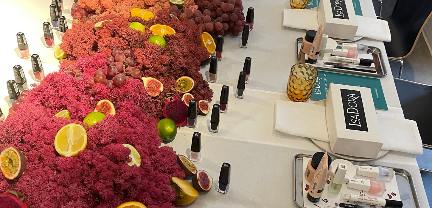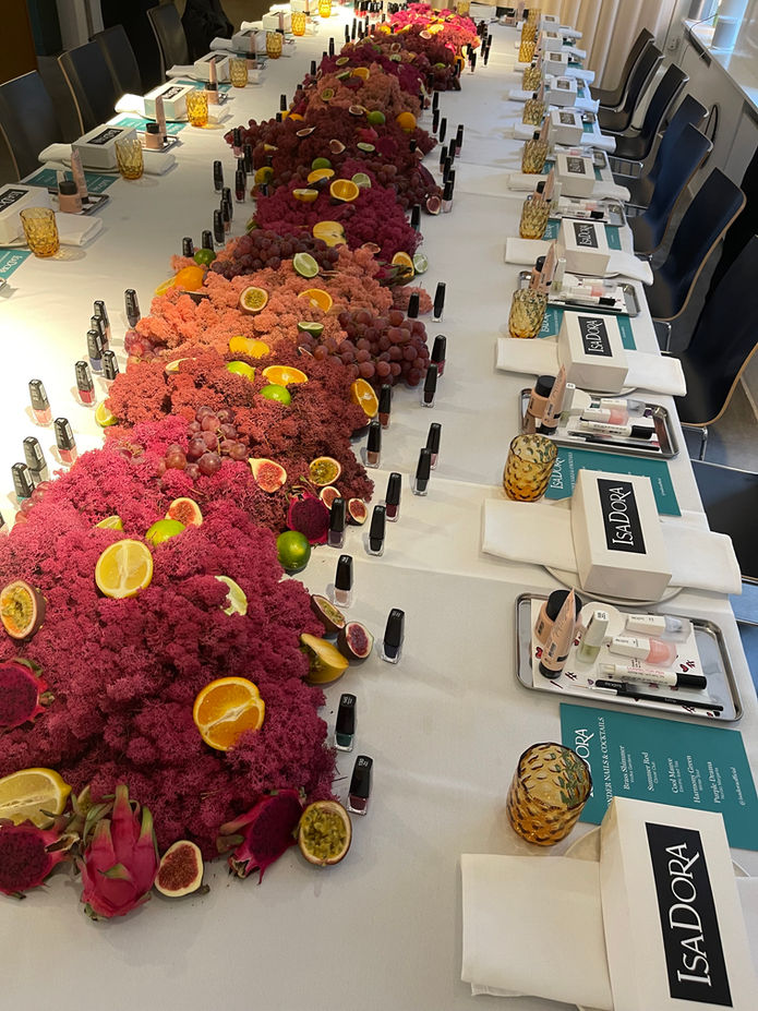 Set design for the celebration of Isadora x Emili Sindlev. Floral installations and vibrant tablesetting – each mirroring the energy of the new nail polish collection. A bold, playful, full-colour expression.
