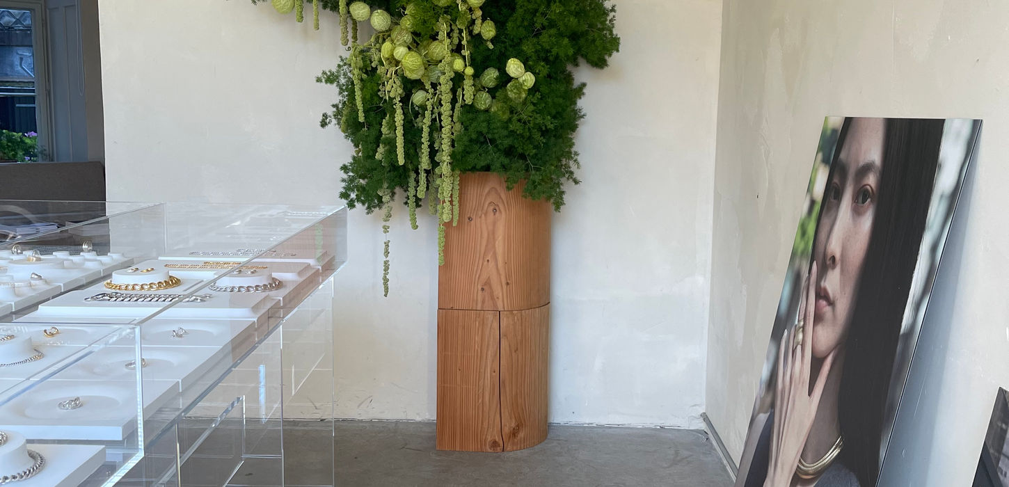 Botanical installation created for Tom Wood’s Fashion Week showroom in Copenhagen. The piece was designed to reflect the brand’s strong sense of identity – raw, sculptural and refined. With materials carefully curated to complement the jewellery collections on display, the installation became an organic extension of the space. A quiet yet powerful presence that supported the storytelling and atmosphere of the showroom, merging nature, design and brand universe into one.